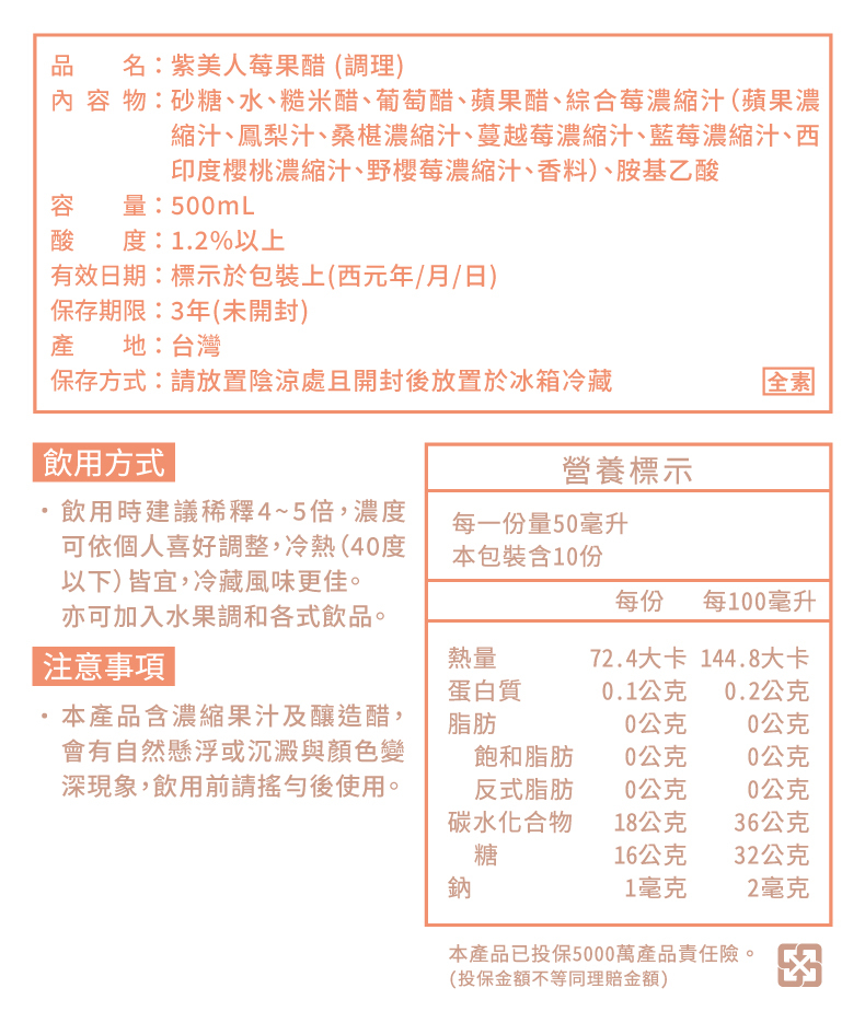水,砂糖,糙米醋,葡萄醋,苹果醋,综合莓浓缩汁(苹果浓缩汁,风梨汁,桑椹浓缩汁,蔓越莓浓缩汁,蓝莓浓缩汁,西印樱桃浓缩汁,野樱莓浓缩汁,香料),胺基乙酸